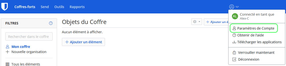 Si vous connaissez votre mot de passe maitre actuel, vous pouvez le modifier à partir du coffre-fort Web :- Dans votre coffre-fort Web, sélectionnez l'icône de profil et choisissez Paramètres de compte dans le menu déroulant :