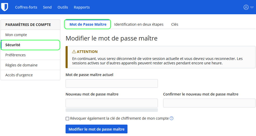 La modification de votre mot de passe maitre vous déconnectera automatiquement de la session du coffre-fort Web. Les autres applications connectées peuvent rester actives pendant une heure au maximum, mais elles finiront par vous demander de vous reconnecter avec votre nouveau mot de passe maitre.